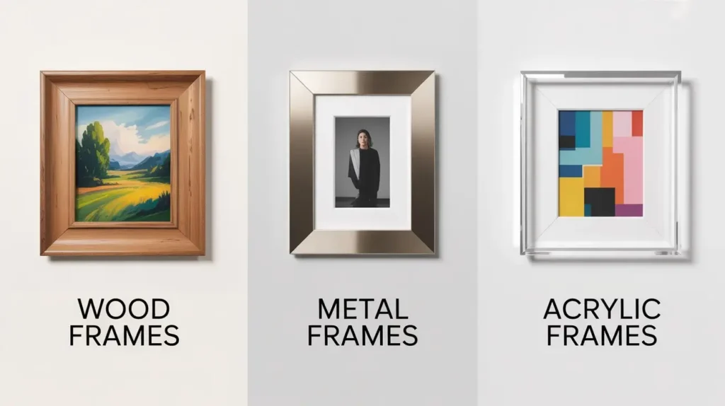 They offer timeless warmth and are fantastic for oils, family portraits, and works on paper. Wood brings a natural, cozy feel to any room and complements both traditional and modern spaces beautifully. This classic option remains popular because it never goes out of style.